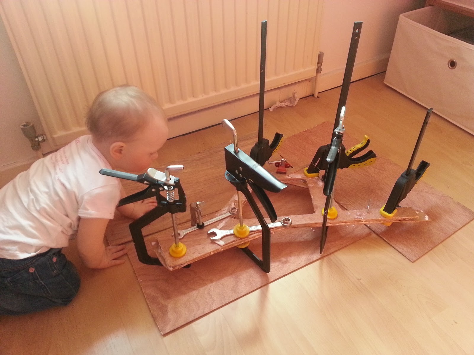 Here it is moved in to the larger drying bay.  Clamps were thin on the ground so I had to improvise slightly...