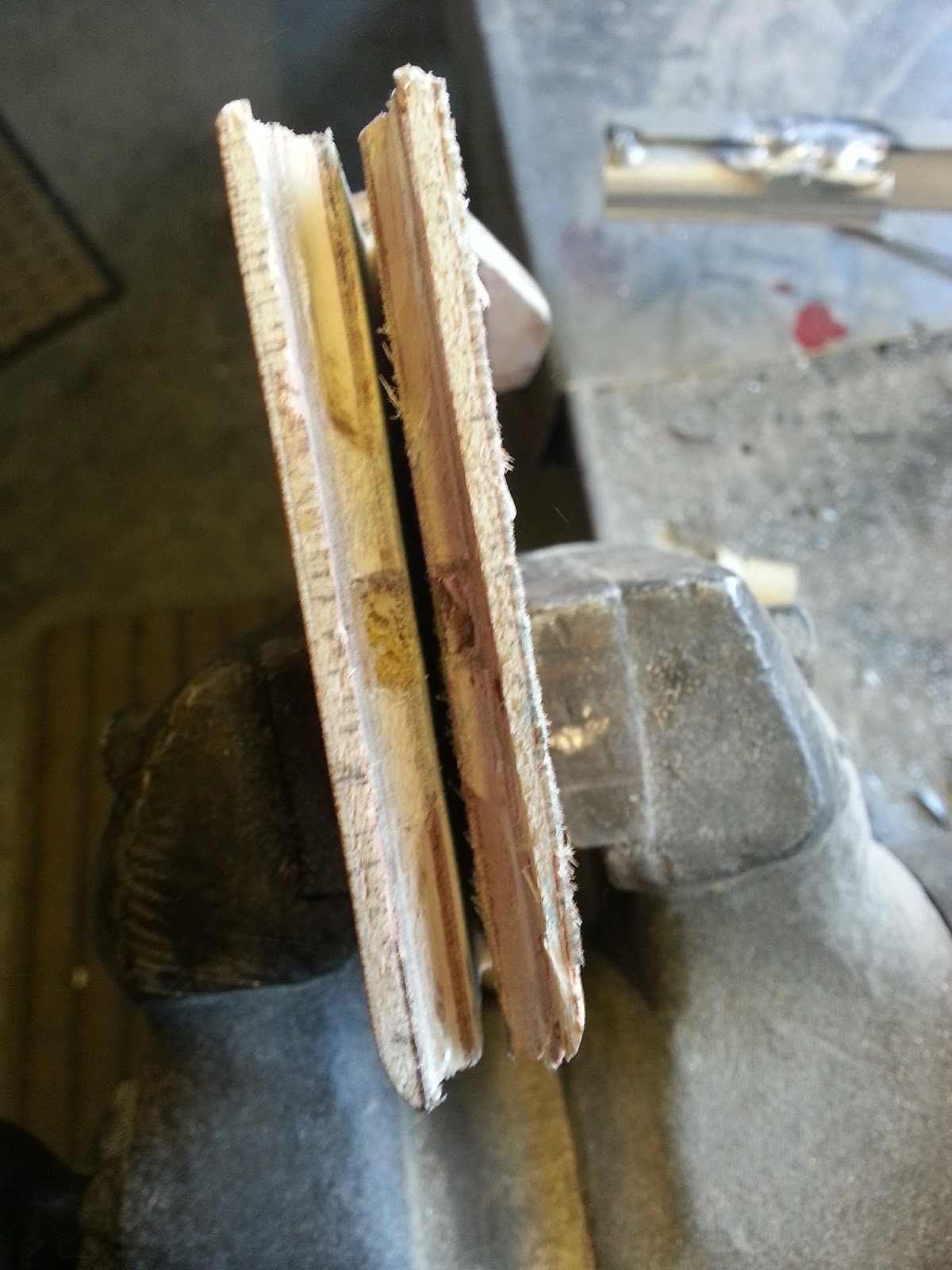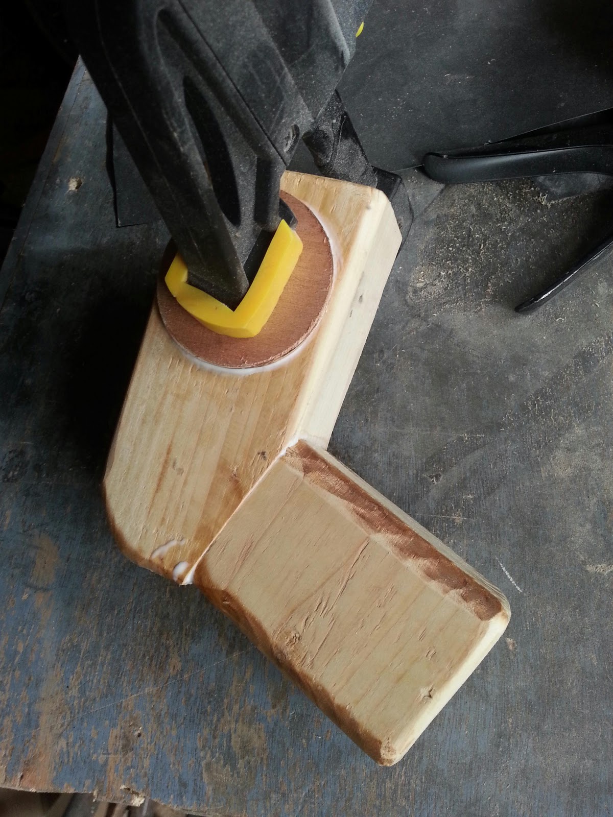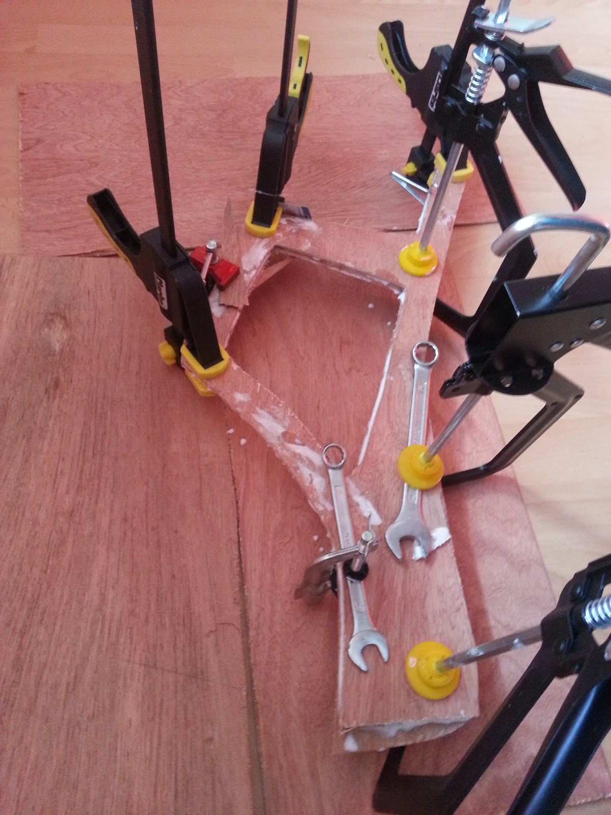 Here is the main frame core, I cut the rough shape 5 times to get the thickness I wanted, glued them all together and clamped it.