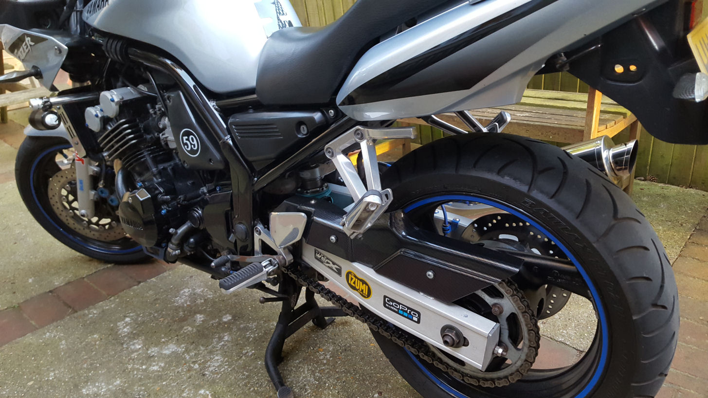 While I'm in that area off with the carbon look rear hugger (Power Bronze) and cut it down to make a carbon chain guard (Really pleased with it) and spray the top of the swing arm after striping off the rear peg hangers and rear master cylinder, then masking up and sanding down before spraying two coats etching primer, 2 coats grey undercoat, two coats of silver and two coats of clear lacquer.