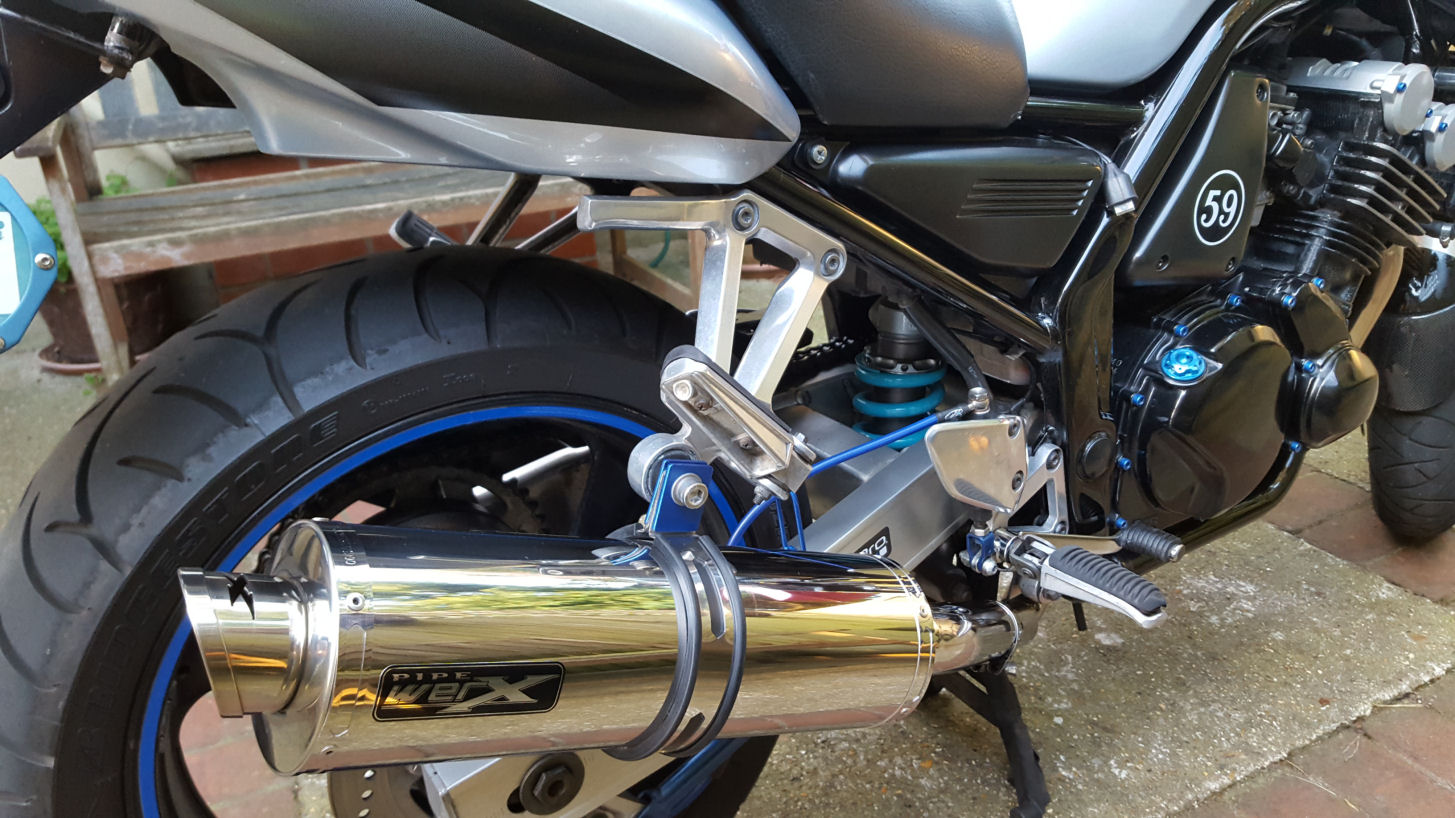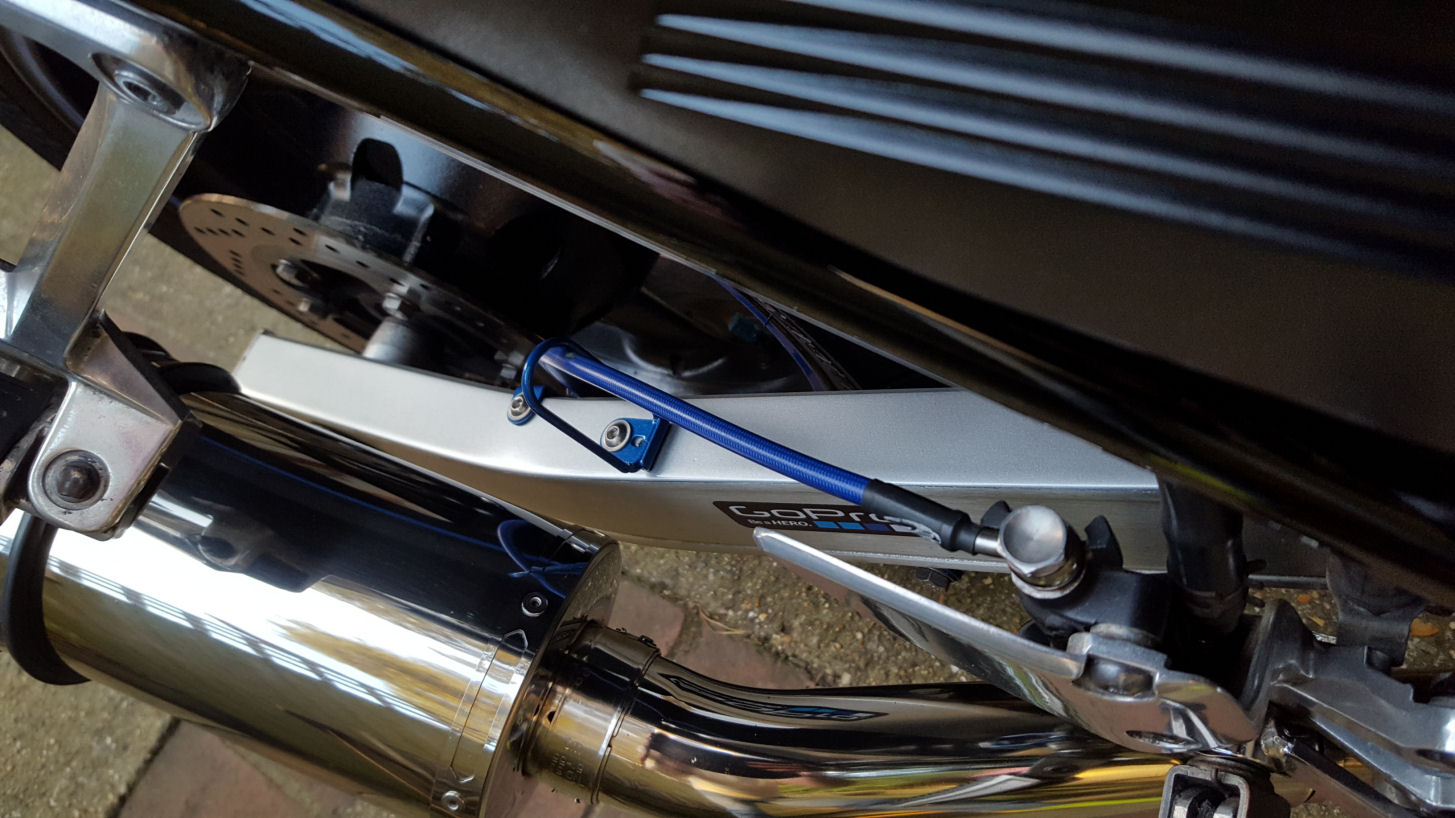 Again I am really chuffed with the finished job looks good, the paint I used is a really good match for the swingarm. I also gave the rear brake line loop and anchor point a touch of the blues.
