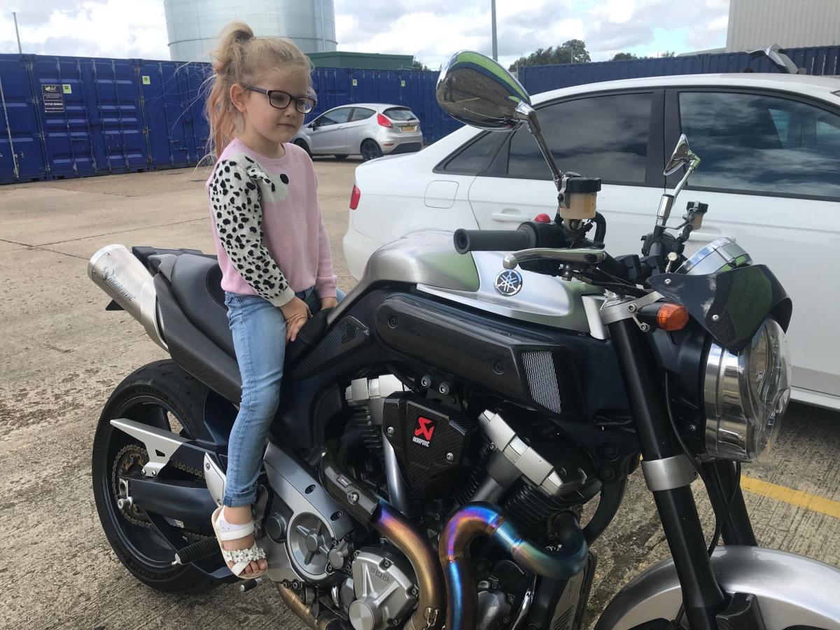 i got this old friend back. since selling it to me mate tom about five years ago hes done a few quid onnit to say the least. acra ti system is gorgeous. single seat unit and various carbon fibre is nice, but the uprated clutch and MCT suspension is even nicerer. parked outside me workshop, is it cool? me grandaughter thinks so... Big Grin