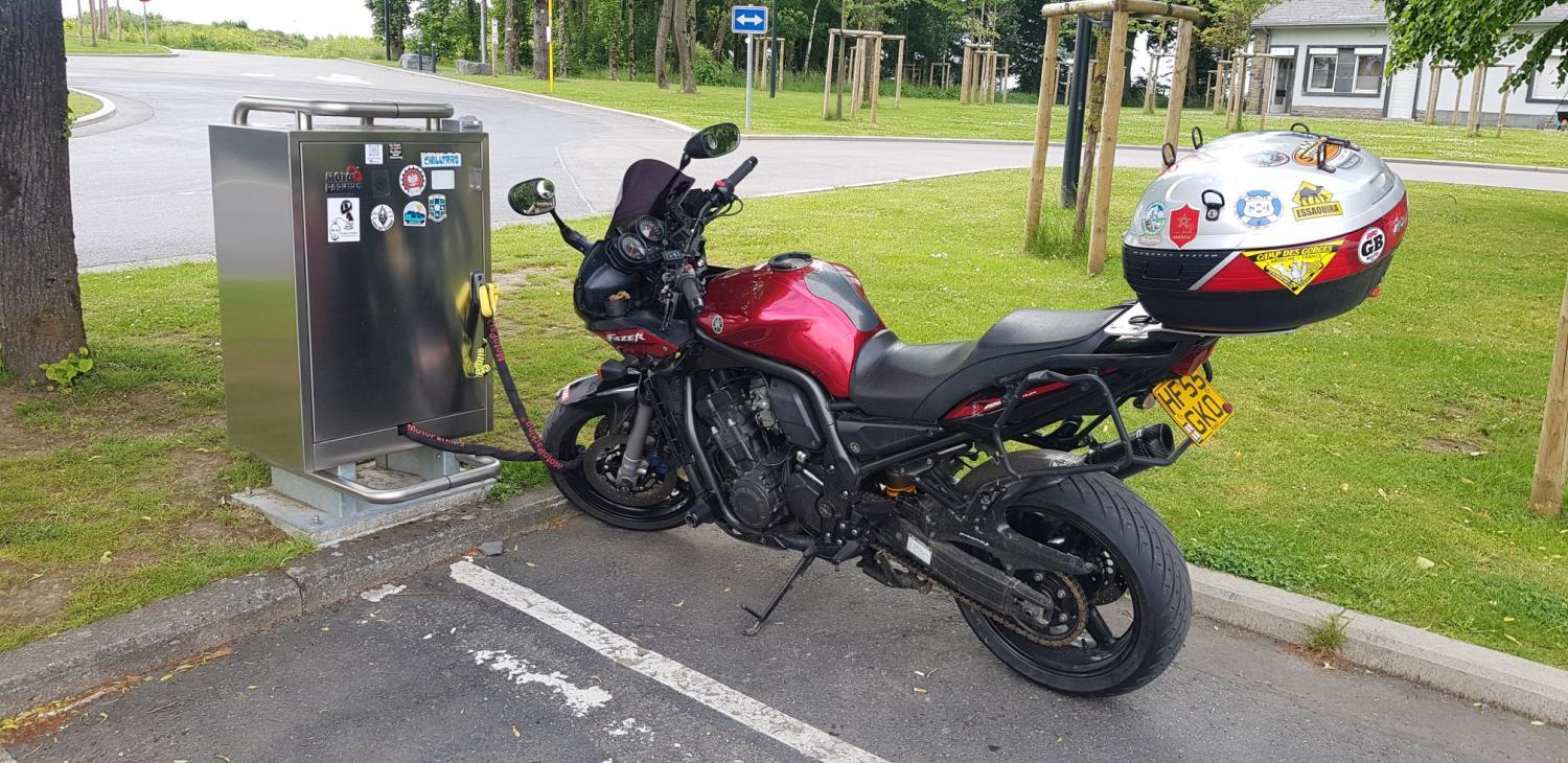 (10-06-22, 11:55 AM)robbo link Wrote: In the carpark at the Bastogne museum, there was a dedicated motorbike parking area, each space with a cabinet and attached chain. The shelved cabinet was used to store my crash helmet and tankbag, the chain passed through the front wheel and locked to the cabinet door hasp with my disc lock. Never seen this set up before