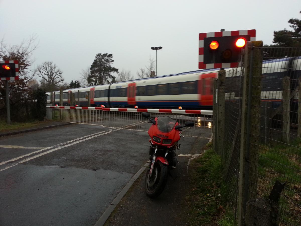 I pulled on to the pavement after the crossing and got off to wait for the train. When I was done, I went to get on the bike, and realised there was a police car about 3 cars back in the queue for the crossing, giving me some very odd looks!