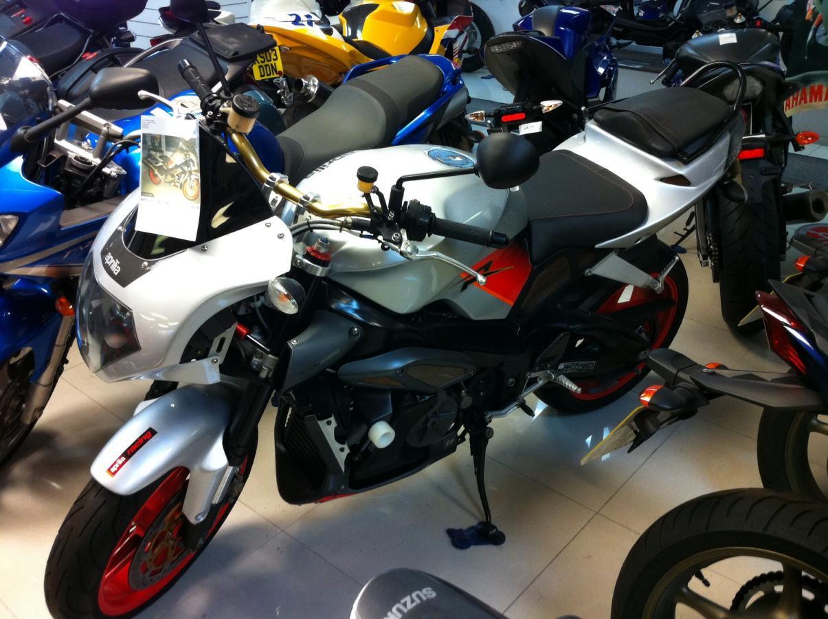 Aprillia Tuono....wow what nice looking bikes these are...hard to inspect the finish closely with the plastic.....had a seat...very very comfy & the bars sit perfect...legs weren't too squashed either....but peering through the plastic revealed a bit of grime & tarnish....even the noggyfighter looks cleaner after a good scrub so maybe that's just the way of things with these bikes.....i would consider a minted one......i can see how cool Stevies R1 would have been with fat wide bars.......it has got me thinking about how cool one of those Honda VTR1000 firestorms would be with wide bars....& i wonder who could do a conversion for me...worth a thought while I'm in dream land.