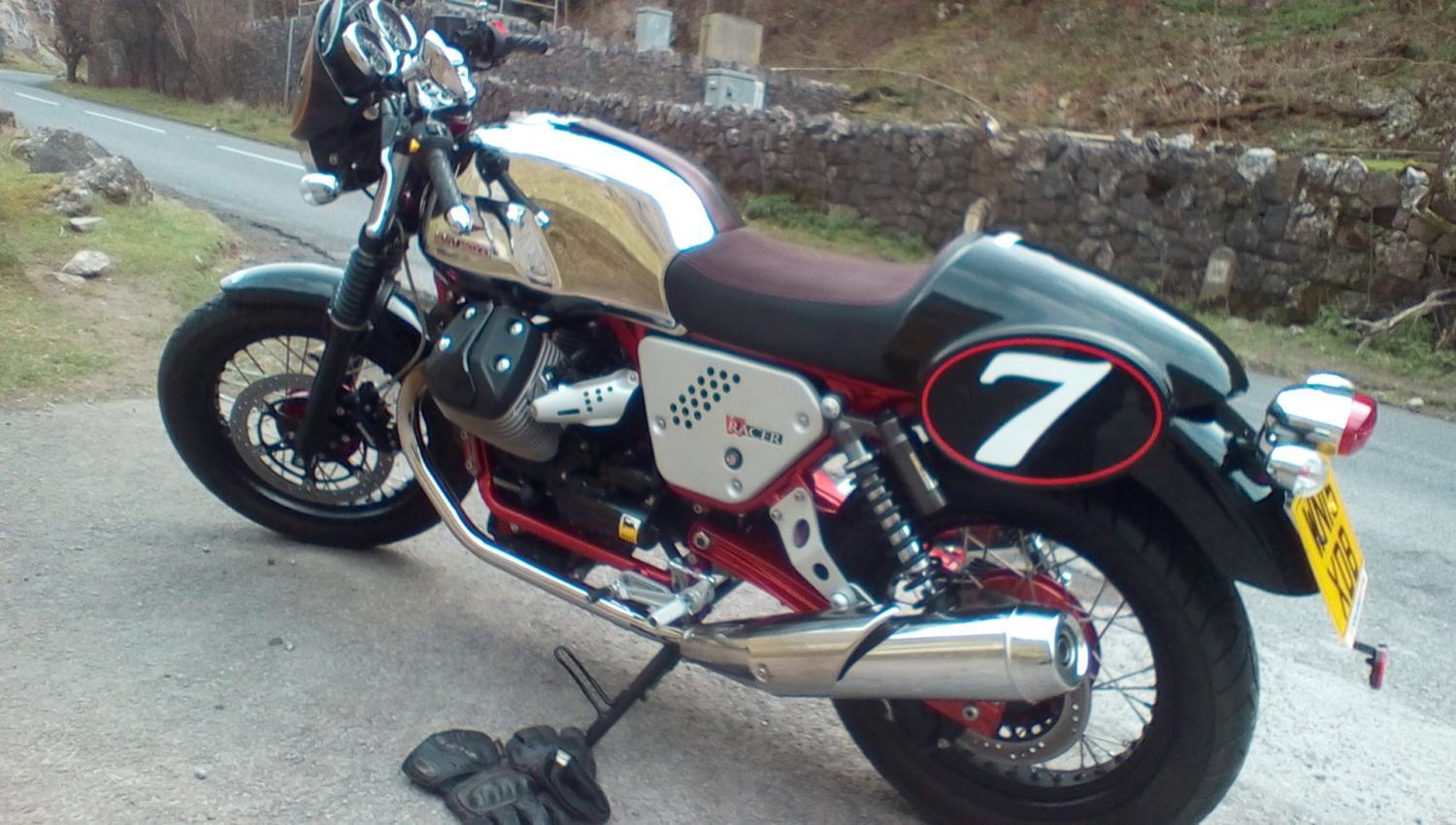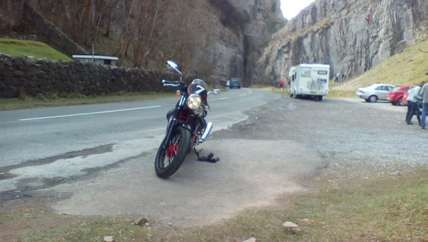 Took the Guzzi for a spin down to Cheddar , stopped for a coffee and a natter , then came home via Chew Valley Lake .