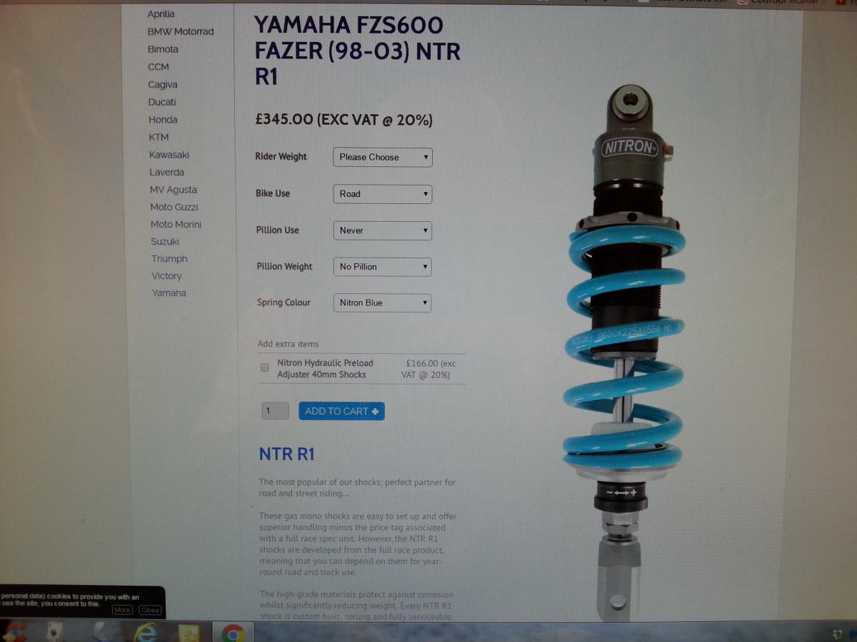 I'm told that it really improves the handing and makes the bike feel much more planted, so was about to make the purchase and started reading things like the Hagon is a good unit but if you really want the best go for the Nitron Gas shocker, so will most likely go the Nitron route trouble is its £414-00 with VAT as opposed to £299-50 with VAT for the Hagon unit. OUCH!