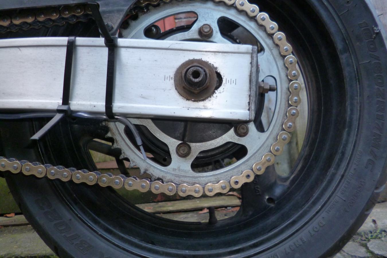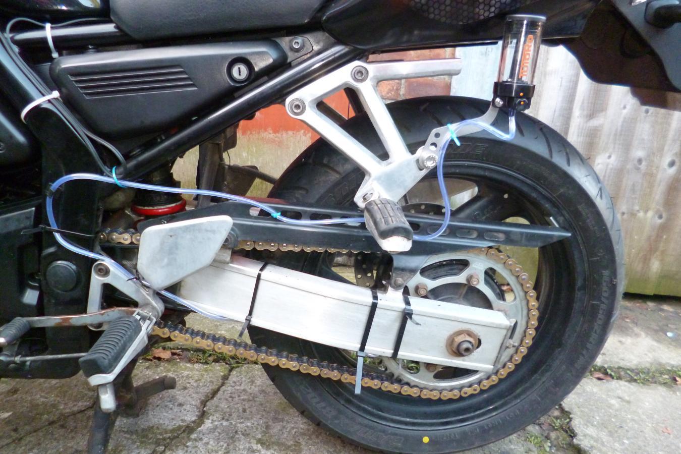 I fitted a Tutoro chain oiler on the 'winter' 600 this morning. At dinnertime I went for a 20 mile spin to check the flow rate. I had to decrease it a bit. Started raining half an hour after I got back. I shall tidy the zip ties up in the morning and, weather permitting, go for a longer ride to fine tune it..