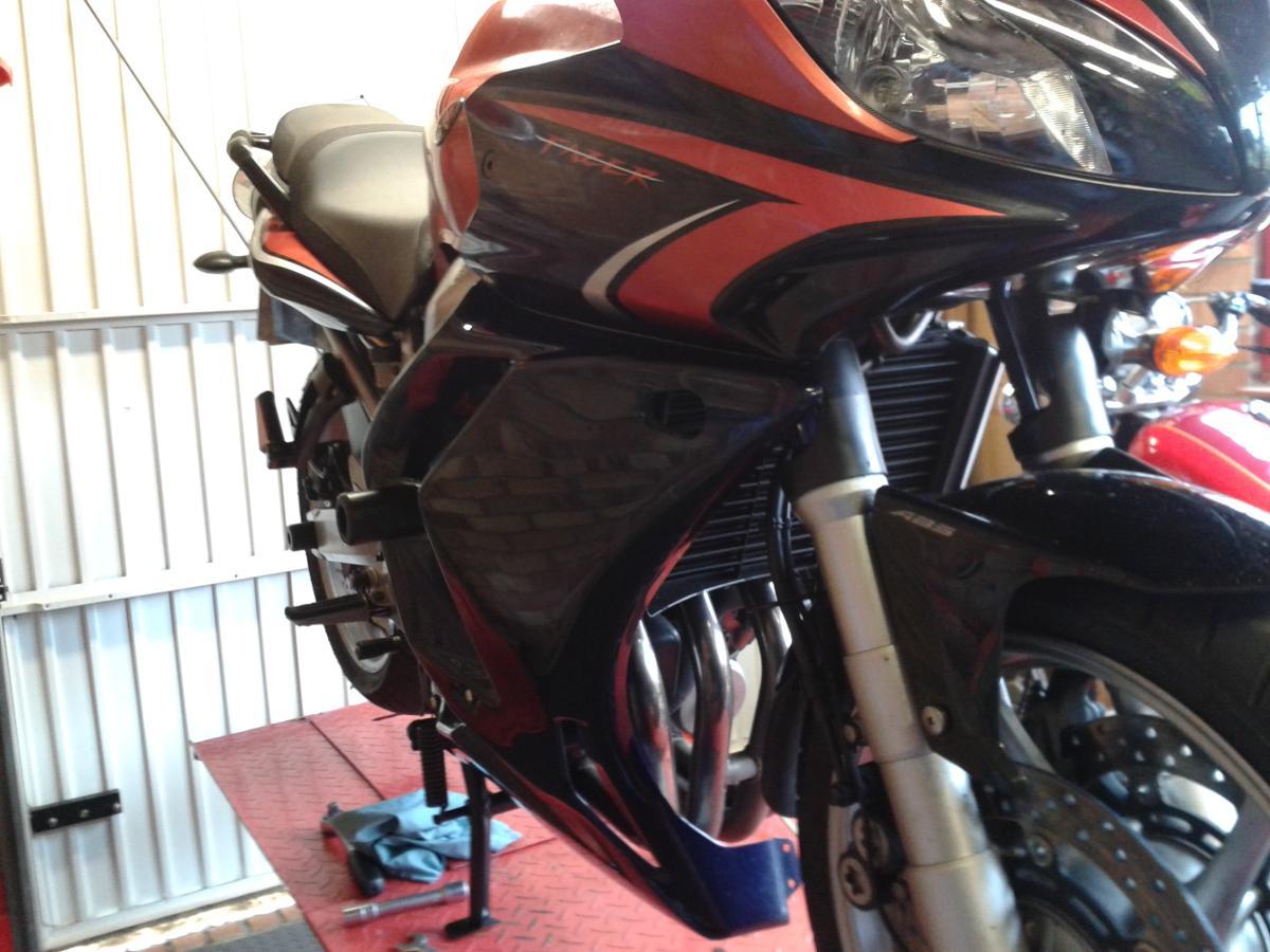 Bit of furtling with the lowere fairings that i bought a while back. I wanted the crash bungs and fairings, so ive had to cut out where the bungs fit. Rubbed down and ready for painting, but cant decide orange or black