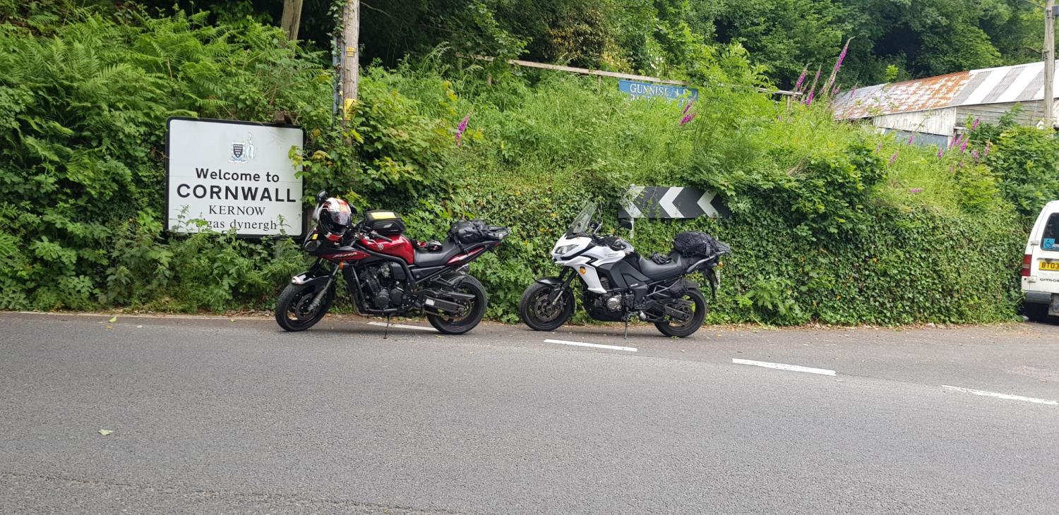Skirting Exeter, we briefly got back on the A30, before taking B roads across Dartmoor and on to Gunnislake. This year there seemed to be an abundance of foals grazing by the roadside. They're not as chilled out as the adult ponies, so a lot of care is needed in getting past them as they're very unpredictable when they decide to run. Over the last cattlegrid and back into civilisation, the villages leading to The Tamar were quickly navigated, before we pulled up next to the Cornwall sign for the obligatory photo opportunity. Then it was on to the pub where I'd booked a table, gassing up at the village petrol station on the way, so that we'd be good to go after our meal.