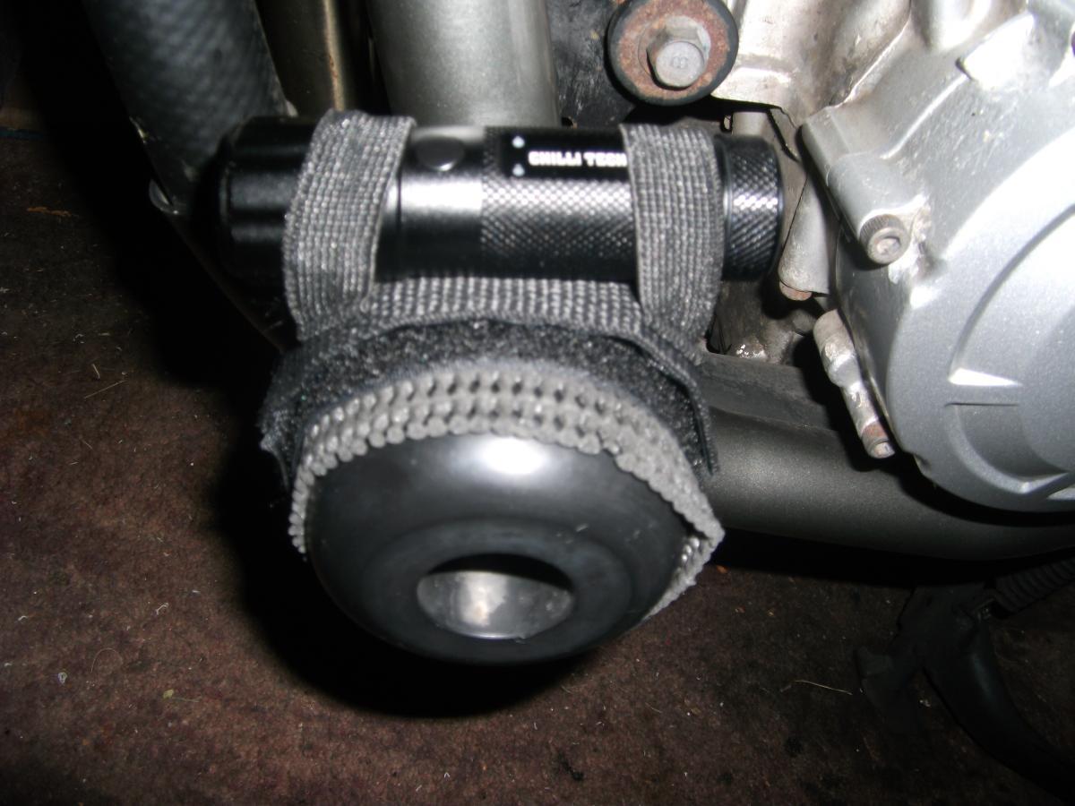 No Paul, on the left hand crash bung. A bit of the Velcro strap that came with it, and a strip cut off of one of those sticky "blanket" things that you use to protect your paint from luggage. The strap with elasticated loops came with the camera too. I promise you, that set up does not move a millimetre once on, unless you undo the Velcro strap.
