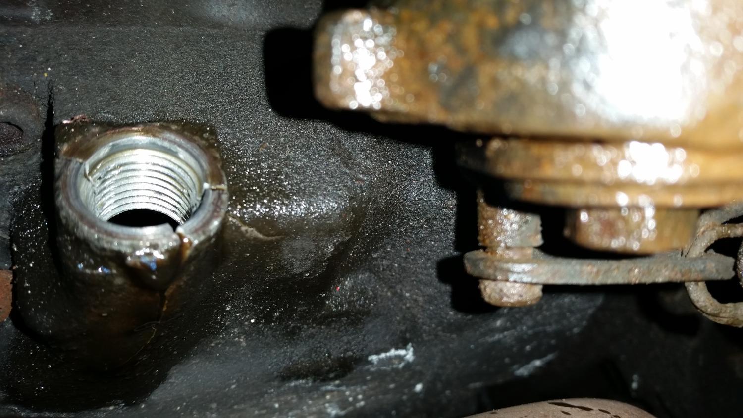 HAHAHAHAHAHAHA nice one Dazza...... Seriousley tho that's weldable..... Take it to an engineering shop and get em to weld and retap it. No more than £50 and get em to put the bike on its side for access.