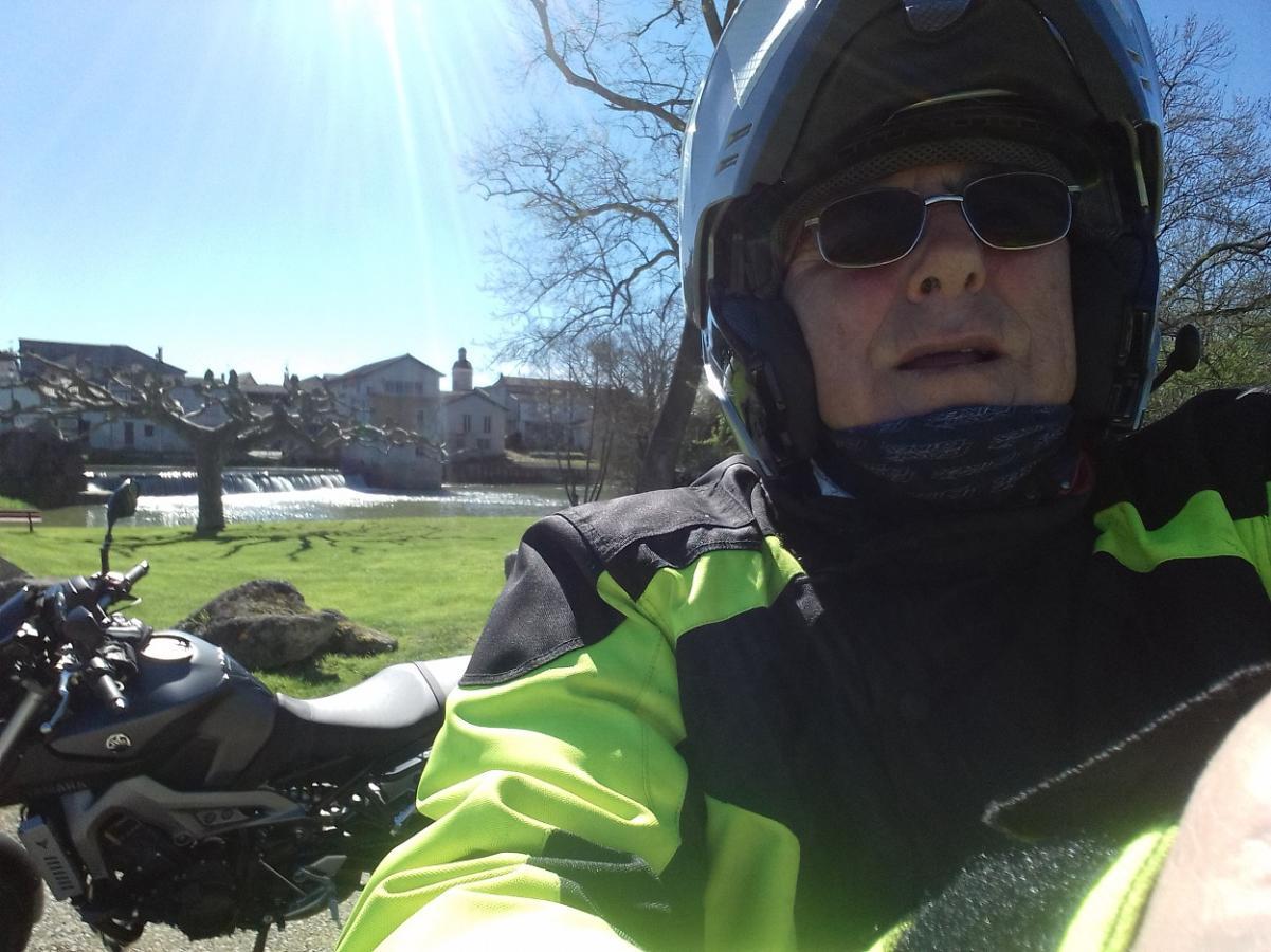 You and your bike beside a river bank with a weir in the background?
