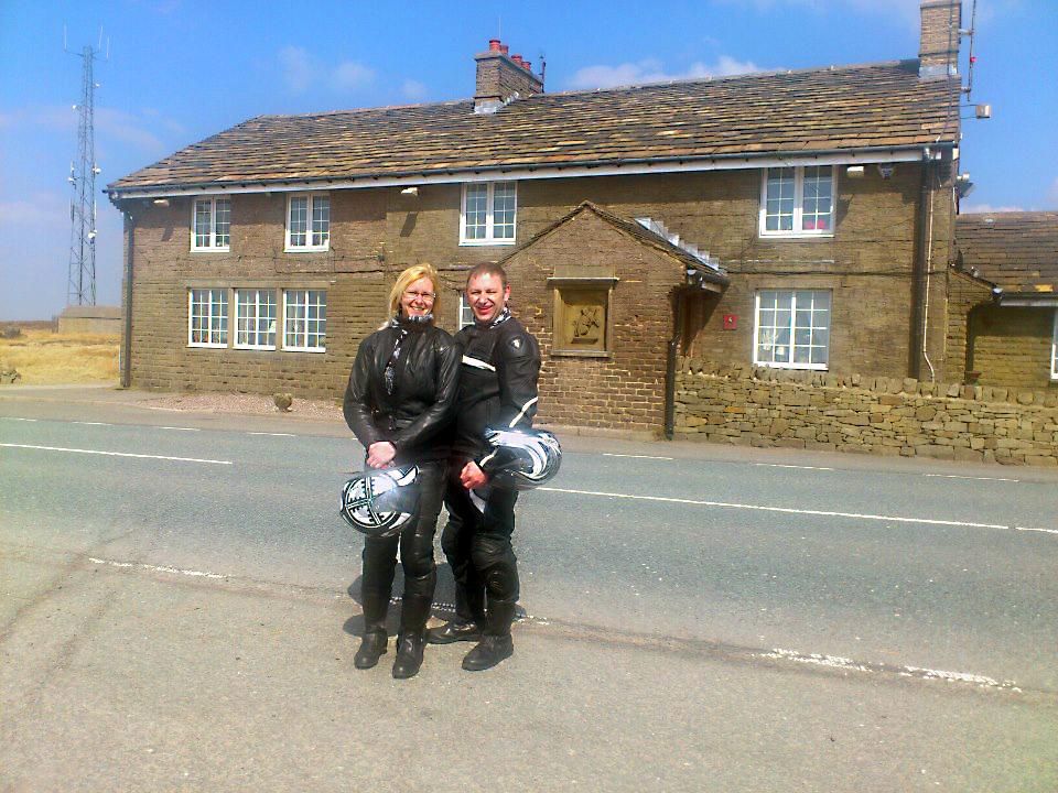 horay just done my first run through the peak district this year nice to see so many bikers out and about , suppose to be 14c but wind chill made it more like 8c so should have put my warmer leathers on , started at elland through to oldham then onto snake pass over through hope valley then onto the cat and fiddle , bite to eat then did the cat and fiddle run shame theyve knocked it down to average 50mph  then home all in all about 180 miles done and 6 hours in the saddle  :moon nice and sore heres a pick of me and the missus at the cat and fiddle still smileing
