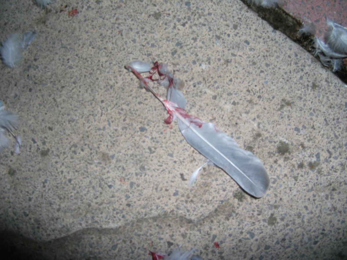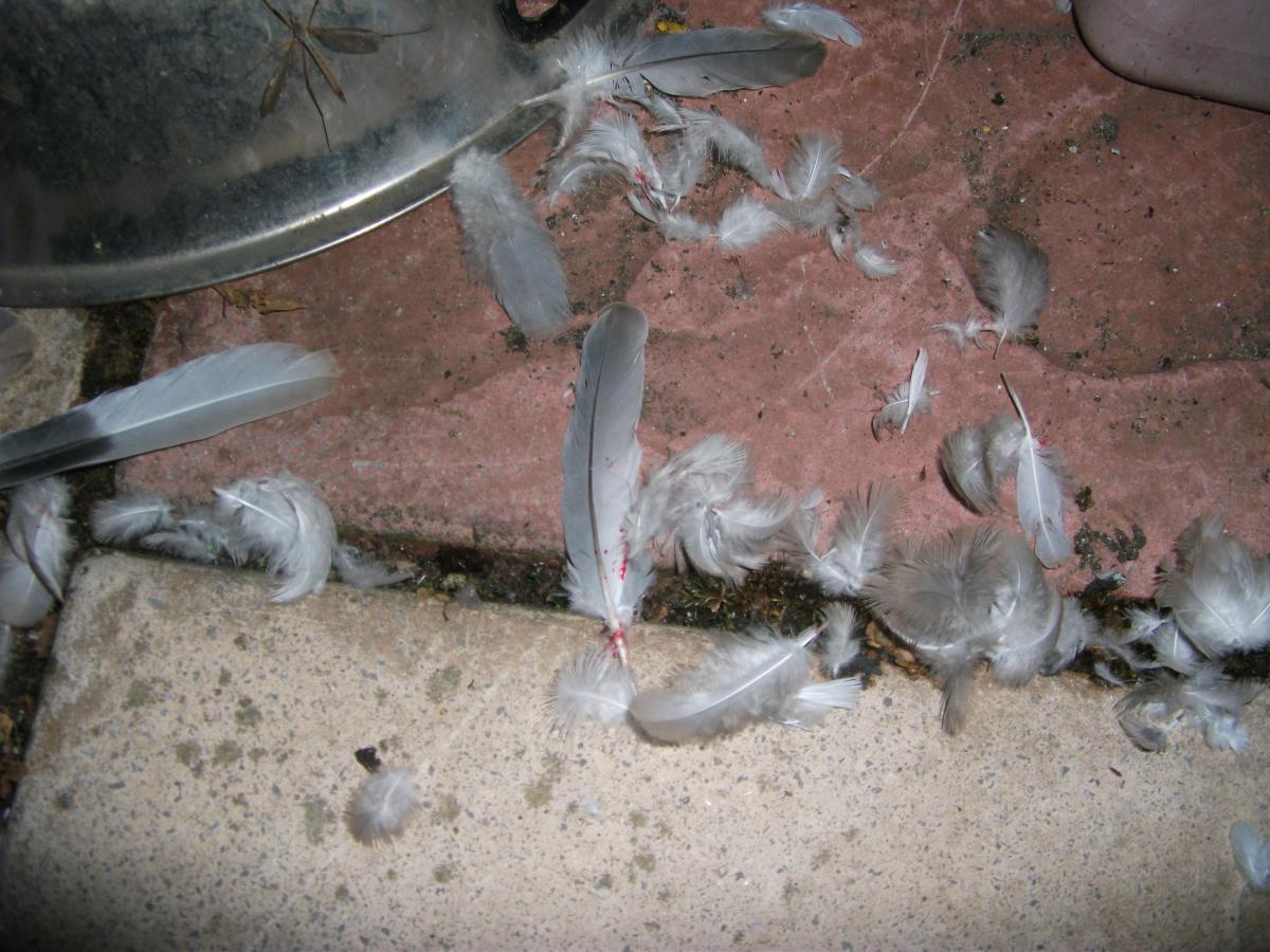 Wow. That's something you don't see too often in your back garden! Just stepped outside to have a quick fag, and disturbed a Sparrowhawk that was busy ripping up it's prey on the patio! Judging by the somewhat bloody feathers now scattered around, I think it must have taken a pigeon. I've seen one dive onto a small bird in the garden before while I was quietly sitting outside in the evening earlier this summer, but I must have nearly trodden on the thing this time!