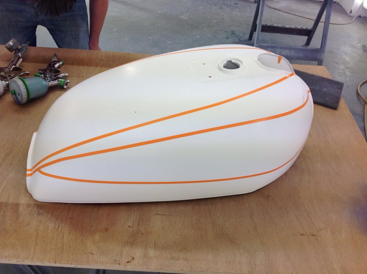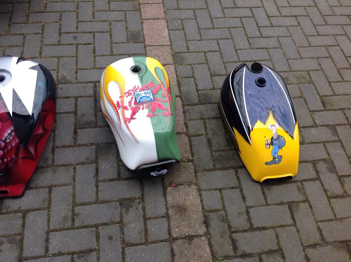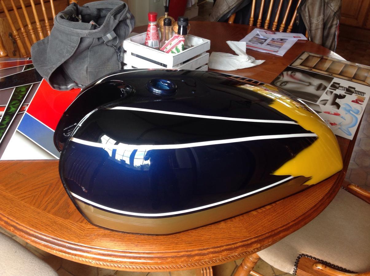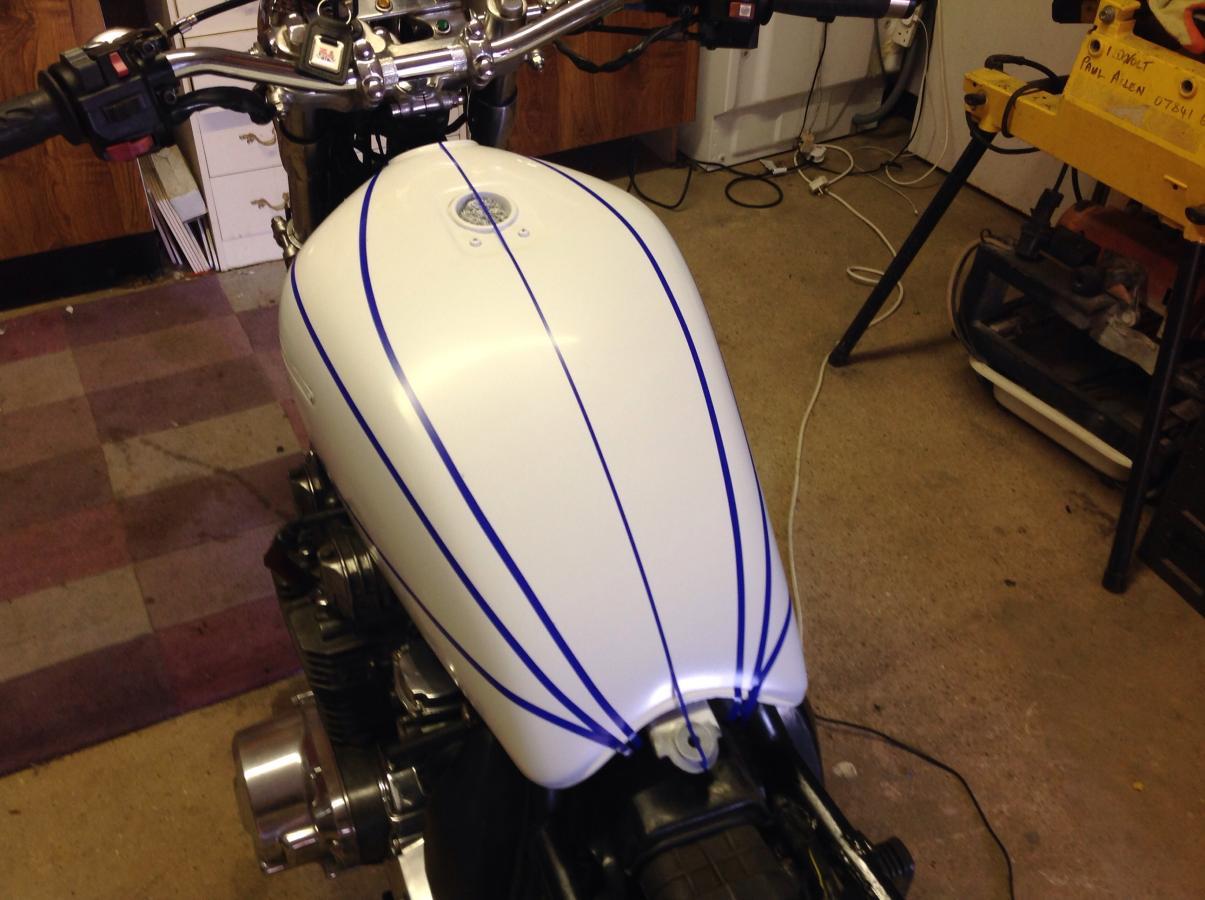 Amongst all the airbrushing, pinstriping, plastic welding fairings and generally learning lots of good stuff I Filled and painted a beat up tank, practised me z1b paint job, then back masked and put a bit of airbrushing onnit.