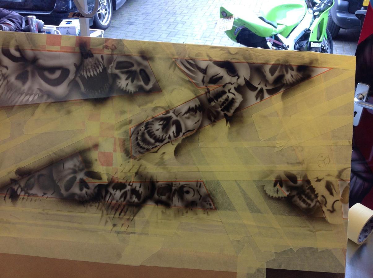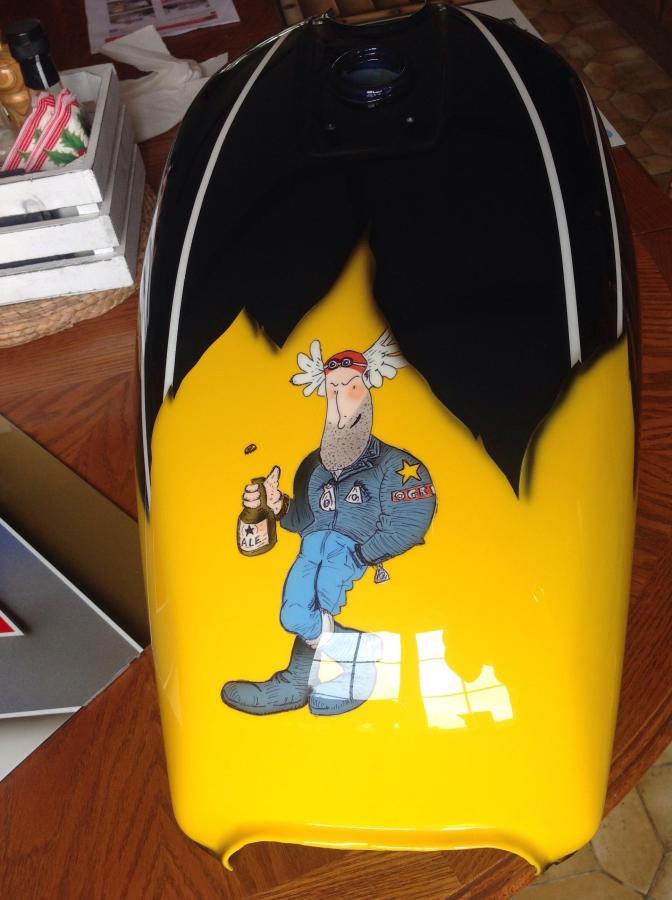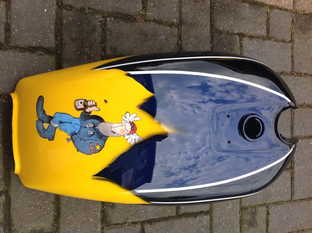 Cheers guys..the ogri figure was airbrushed in...it's suprisingly simple..I googled images, traced over the drawing I wanted in pencil then laid sticky mask over the drawing so it pickedupthe pencil lines, stuck it on the tank and scalpelled out each section and airbrushed it in...hardest bit was the rosy cheeks, if I'd fucked that up it would have knackered the whole thing, then used a biro pen to do the lines..honestly, far easier than you would think.